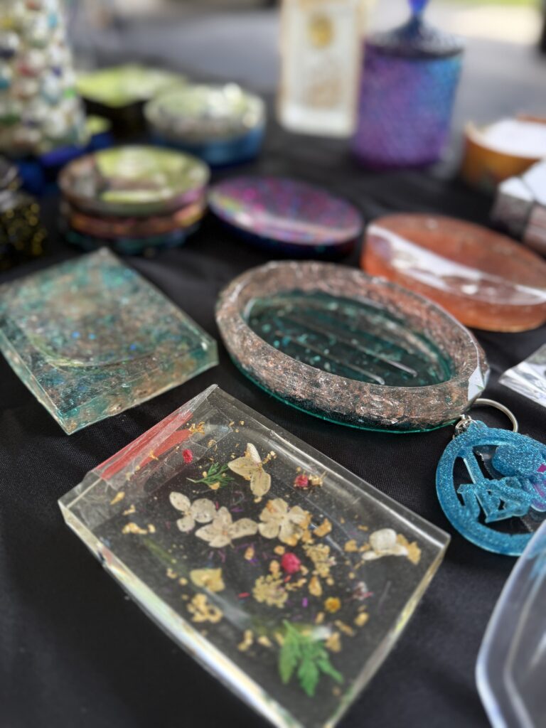 Resin art with personality! Deb offers custom coasters, jewelry, clocks, vases, and more — each piece is a whimsical blend of color and creativity.